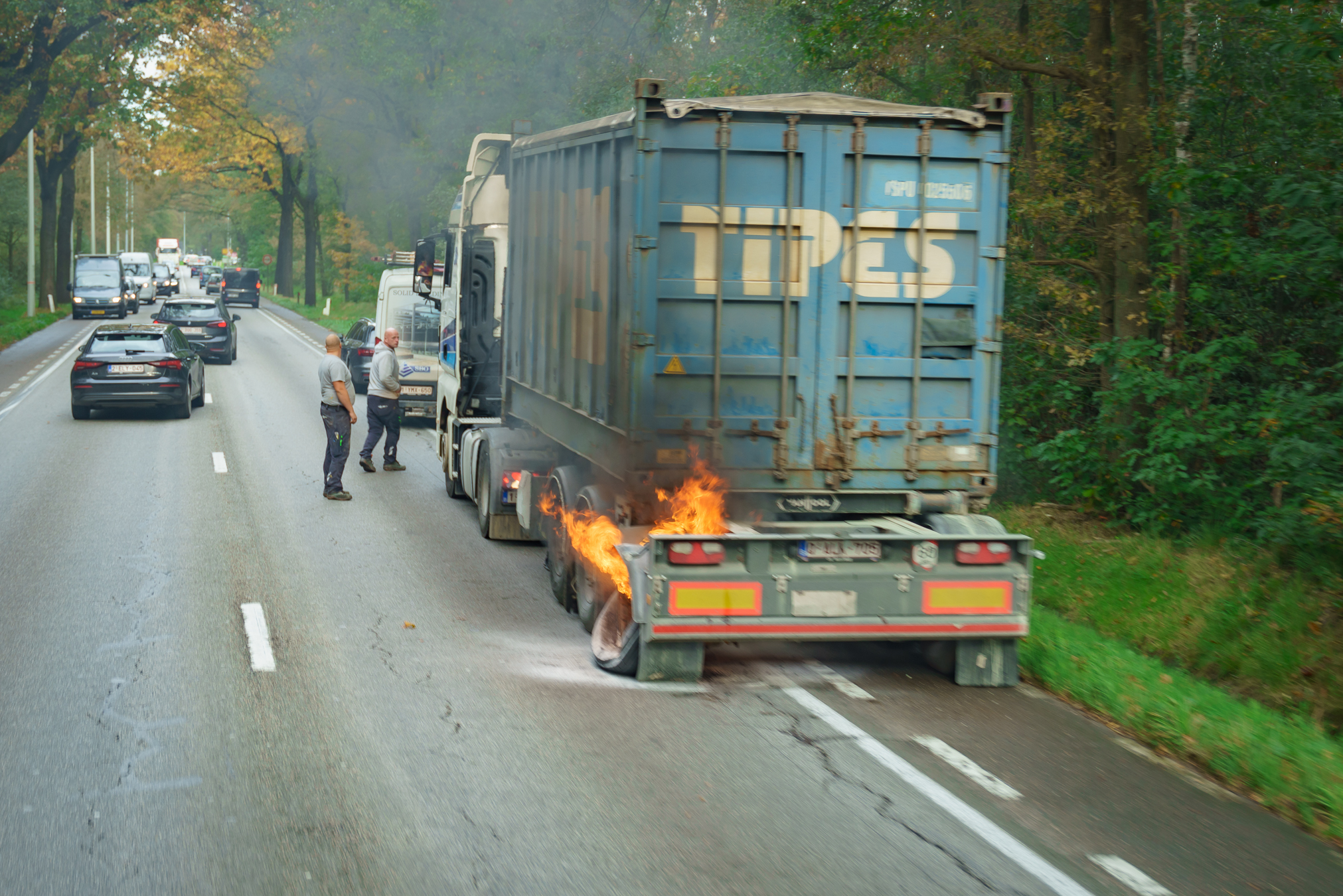 Op de terugweg komen we in een onverwachte file terecht. Al snel zien we een grote rookpluim verderop. Wanneer we dichterbij komen, blijkt dat er een vrachtwagen in brand staat. De brandweer is nog niet ter plaatse, maar er is al veel hulp voor de chauffeur. Met man en macht proberen ze de trekker onder de trailer vandaan te rijden. Wij kunnen weinig doen en besluiten verder te rijden.