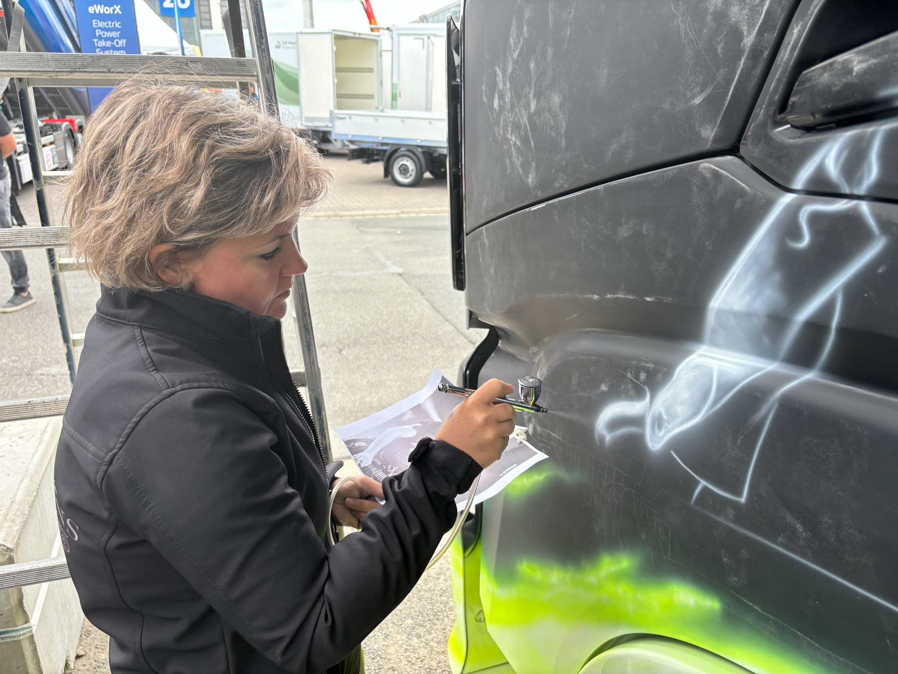 Vervolgens werd de truck gespoten door Spuiterij Hommersom in Tiel. Na het spuitwerk werden de oppervlakken waar de special paint op moest komen vervolgens weer licht geschuurd, zodat Willeke van MWDesigns daarmee aan de slag kon. Dat special paint werk werd live gedaan tijdens de IAA in Hannover. Willeke en Marcel hadden daar twee dagen volop aanloop en bekijks, waarbij de toegestroomde media veel belangstelling hadden voor hun werk. Het blijft heel bijzonder om te zien hoe Willeke, schijnbaar uit de losse pols, de levensechte portretten op de truck spuit. Alle vier muzikanten zijn in kenmerkende actie-poses vastgelegd op de zijkanten in zwart-wit waardoor de levensechte afbeeldingen duidelijk aanwezig zijn zonder te schreeuwen zeg maar. Uiteraard werd tijdens de hele special paint sessie muziek van Metallica gedraaid die door de speakers in de kastenwand overal te horen was.