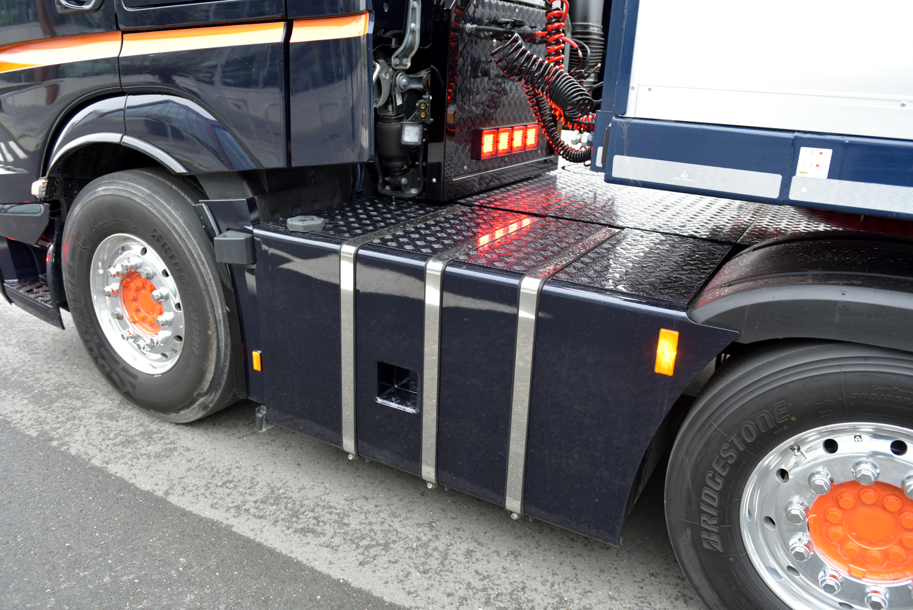 Het resultaat mag gezien worden. De trekker is uitgevoerd in donkerblauw met oranje details en met veel oranje kleurige verlichting aan de voorkant. Zelfs de verlichting achter de ster is oranje. Door middel van een slimme schakelaar kan alles echter zo veranderd worden in egaal wit aan de voorkant. Verder is de truck voorzien van een diepere zonneklep van VOX-parts met daarin verstralers van Lazer. De dodehoekspiegel aan de voorkant is vervangen door een Orlaco Corner View camera op de rechterhoek van de truck.