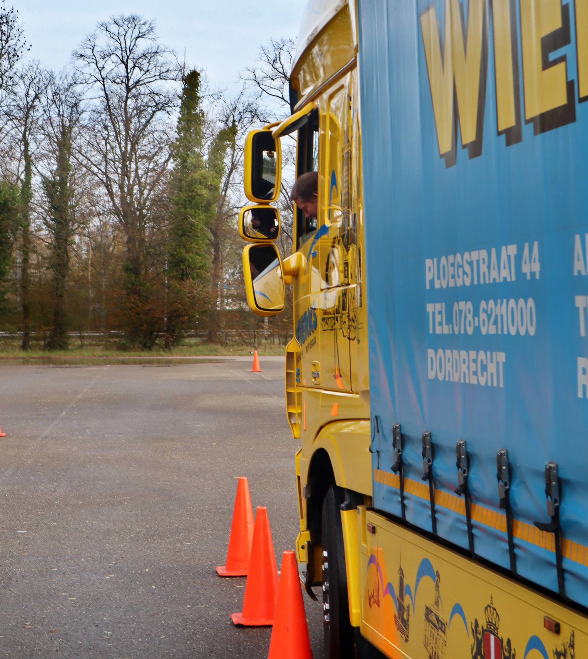 De volgende dag stond de Toets Besloten Terrein op het programma. Of zoals instructeur Arie het noemde: pielen met pylonen. Het idee is vrij simpel: je zet een hoop pylonen op een afgesloten terrein en daar rijd je tussendoor. Al is dat met een vrachtwagen natuurlijk een flinke uitdaging, vooral als je 's ochtends voor het eerst op deze auto stapt en nog niet zoveel ervaring hebt.