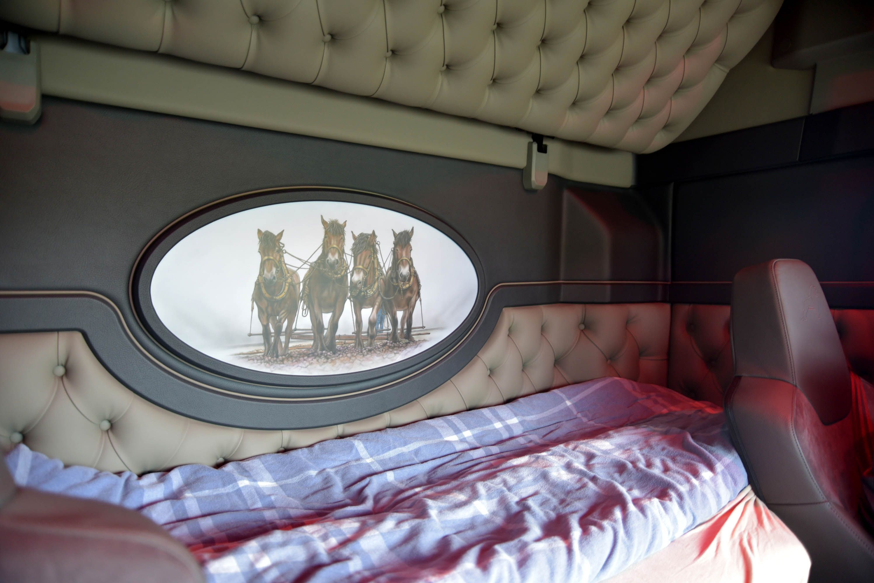 Nadat de truck compleet was gespoten in de huisstijl van Zwaagstra werd er nog een persoonlijke touch aan het interieur toegevoegd met een speciale achterwand, lederen vloerbekleding en extra sfeerverlichting. Chauffeur Wijtse: “Ik heb nu de eerste rit gedaan met de auto en hij bevalt mij meer dan uitstekend. Wat een rust en ruimte!” Opvallend is dat er gekozen is voor spiegels en niet voor het Optiview systeem. Wietse: “Ik vind dat minder mooi staan en ik hoor onderweg dat niet iedereen enthousiast is over de camera’s. Laat mij maar lekker met spiegels rijden.”