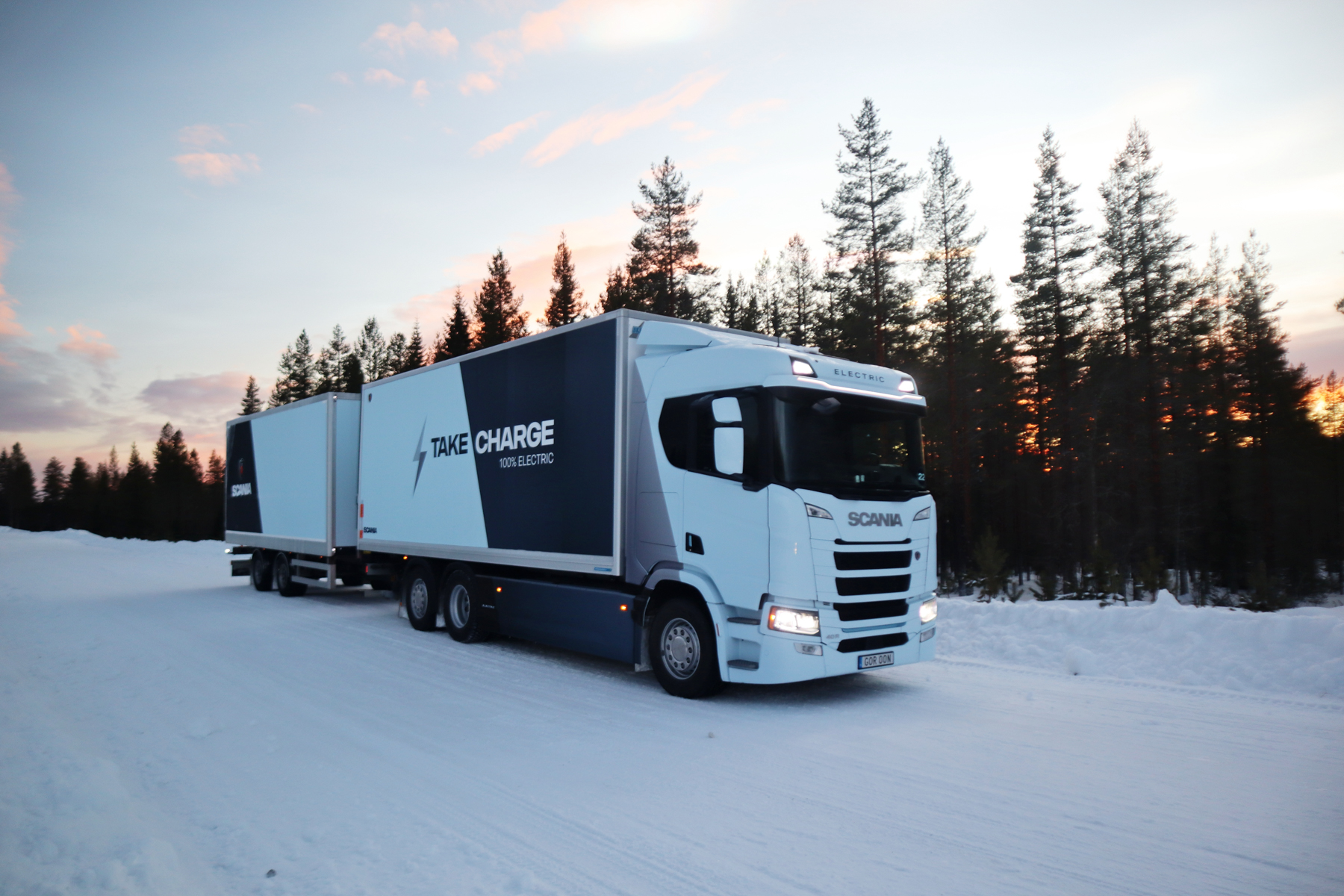 Uiteraard staan er ook elektrische modellen op het Scania Winter Event. Na de V8 en de Super stap ik daarom in een 40R bakwagen met aanhanger. Deze is met 33 ton aanzienlijk lichter dan de vorige twee combinaties. De 40R heeft een vermogen van 544 pk en is daarmee wel vergelijkbaar met de twee diesels van net. Het rijden is echter anders. Bij een elektrische vrachtwagen is echter het complete koppel altijd beschikbaar en reageert de motor direct op een beweging van het gaspedaal. Op sneeuw en ijs is dit iets om rekening mee te houden.