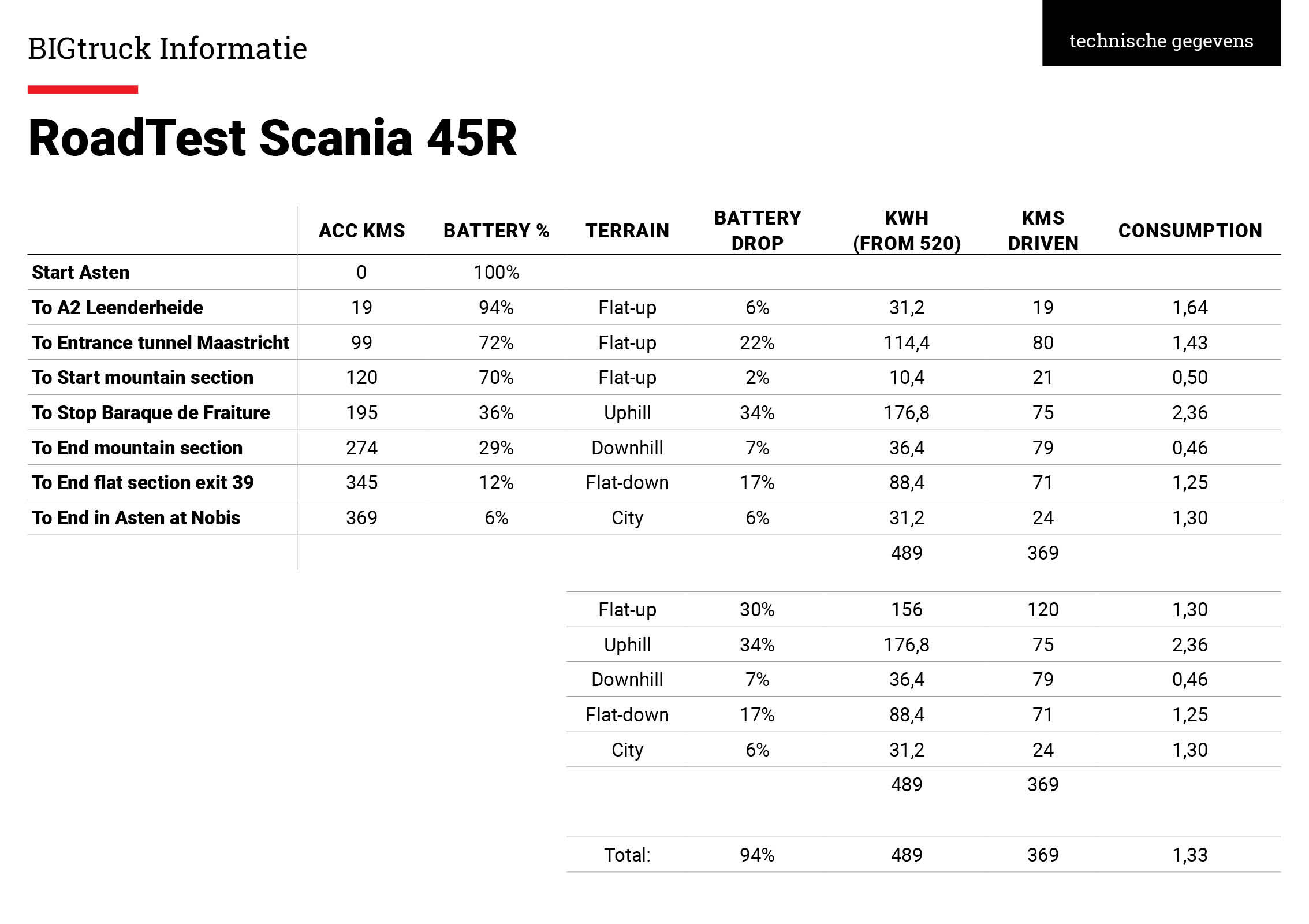 Dat betekent dat het werkelijke bereik altijd hoger ligt, zeg rond de 400 kilometer. Daarmee moet onze testroute volgens Scania dan ook geen probleem zijn, zelfs met de sterke stijgingen in de Ardennen meegerekend.