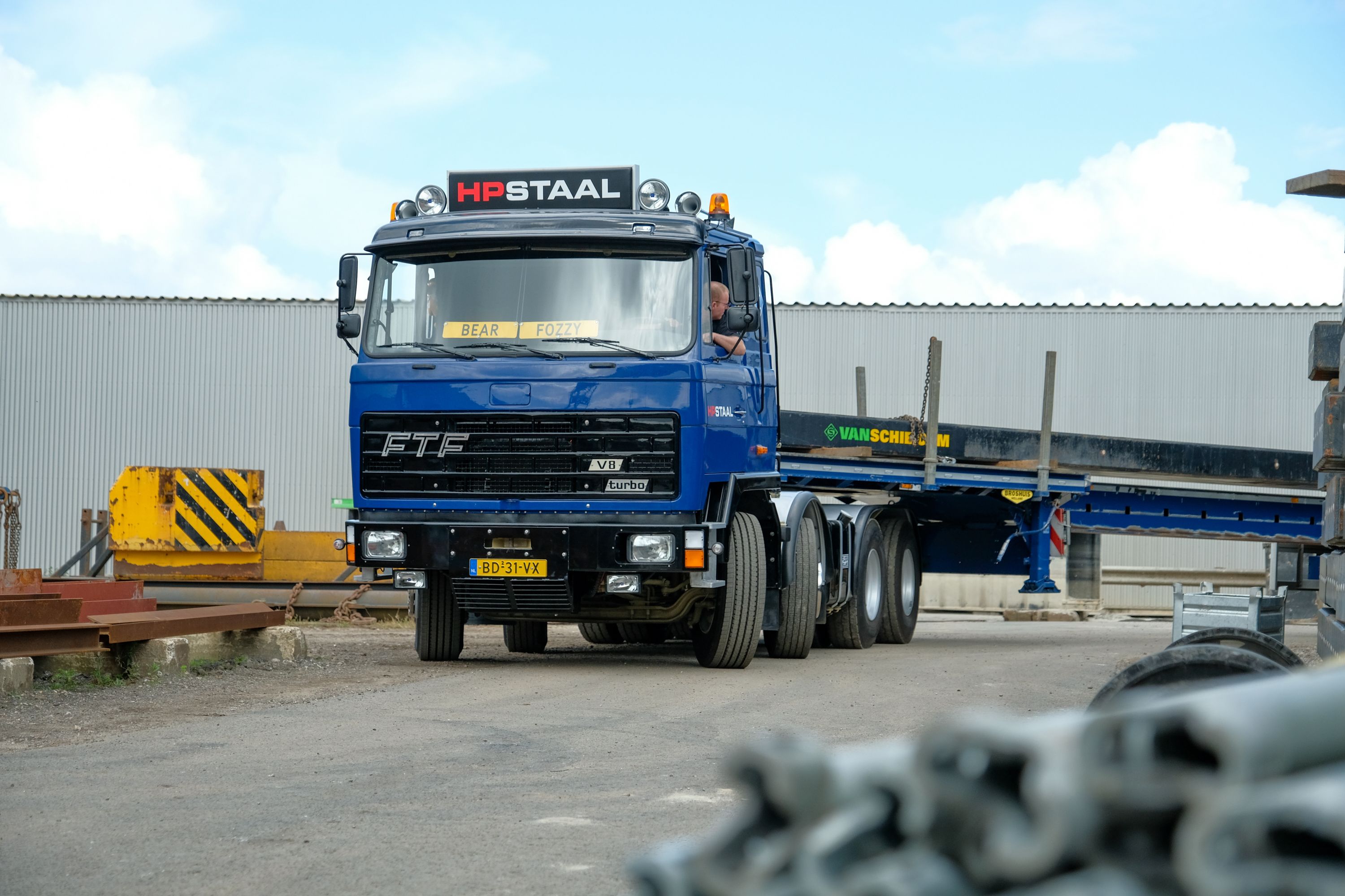 “Het was mijn bedoeling om de trekker weer helemaal te maken zoals die uit de fabriek gekomen was, dus ook in de kleuren van Van der Vlist. Ik kreeg de juiste man niet te pakken en op een gegeven moment wilde ik verder. Laat nou net op dat moment mijn werkgever binnenlopen en die zei dat hij, als ik de trekker in zijn kleuren zou spuiten, de verf zou sponsoren.” Dat roept vragen op, want we staan op het terrein bij zijn werkgever Van Schie en daar kom je toch echt alleen maar gele voertuigen tegen. “Je moet weten dat HP Staal een onderdeel is van Van Schie. En hun wagenpark is dus blauw. Het bedrijf levert en verhuurt staal, dan moet je denken aan buizen en damwanden. Die worden vaak gebruikt voor een project en moeten daarna weer uit de grond gehaald worden. Door de verhuurconstructie kunnen ze nu voor meerdere projecten gebruikt worden en doen we eigenlijk aan een soort recycling.” Weer wat geleerd. “Hoe lang de restauratie duurde?”, Jos krabbelt achter zijn oor. “Lang, tussen aankoop en APK zat een jaar of 6. En heel veel zweetdruppeltjes en moeilijke momenten.”