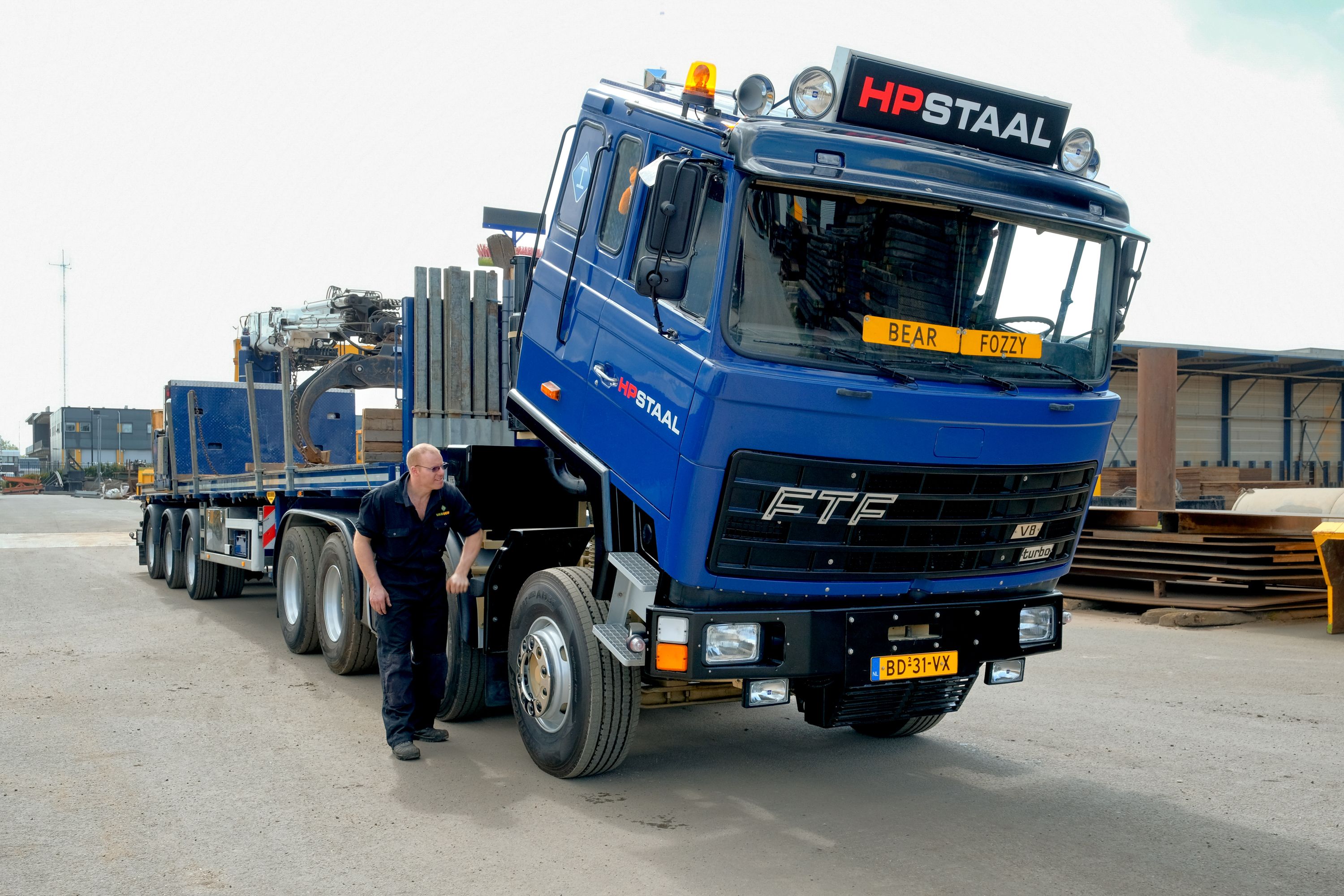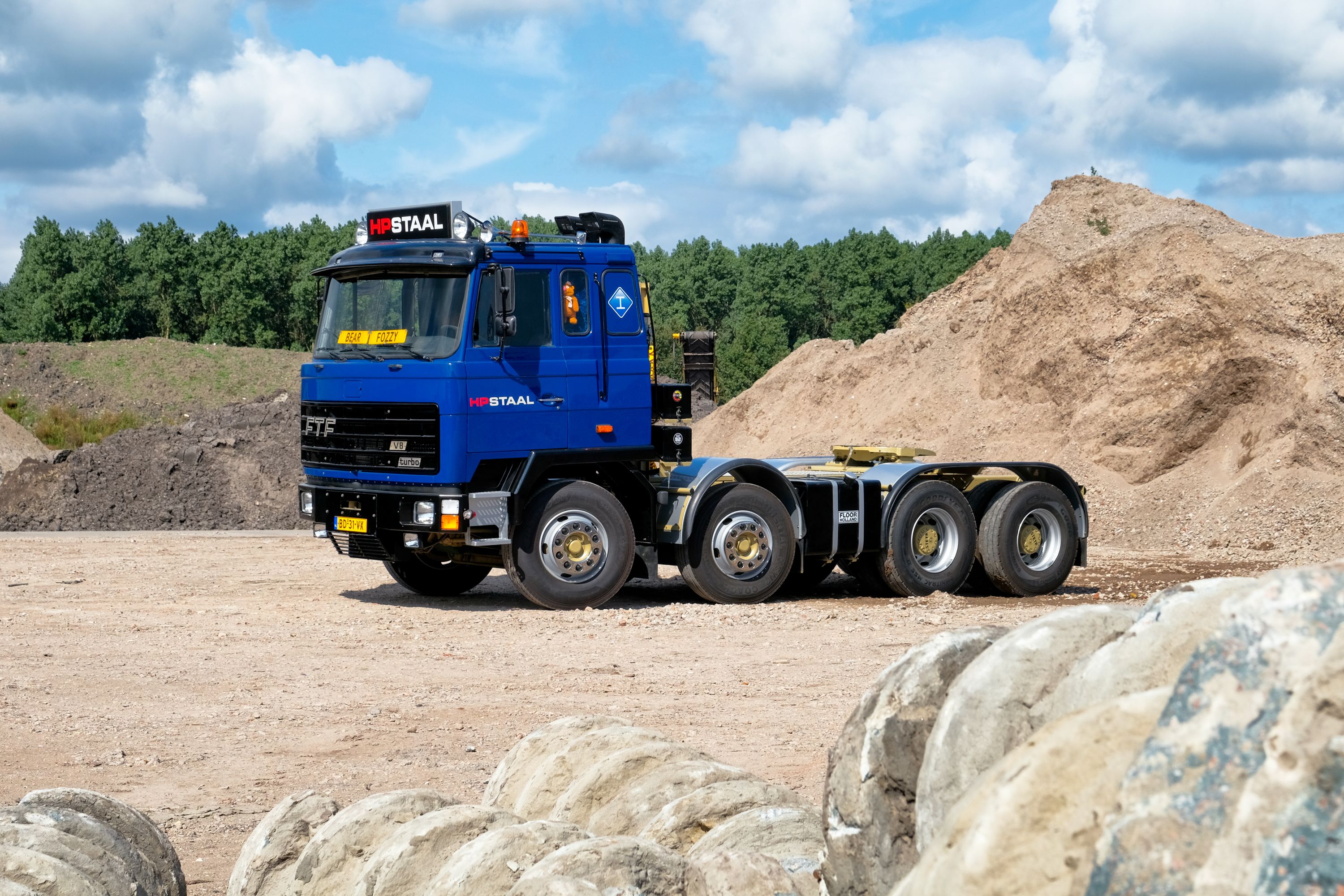 Hierna gaan we de vracht lossen, waarbij Jos een nauw pad in moet. Met de uitgeschoven trailer lijkt dat niet te lukken, maar Jos kan vanuit de cabine de trailerassen besturen en op die wijze lukt het wel. “Je ziet het, hij zou zo aan het werk kunnen, alles wat daarvoor nodig is, zit er op en aan”, zegt hij. Na het lossen met de kraan moet Jos weer achteruit terug en zet de wagen neer. “Zullen we de motor eens bekijken?", en hij kantelt de cabine zodat de groen gespoten V8 zichtbaar wordt. We maken weer wat foto’s, daarna kantelt Jos de cabine weer terug en gaat de trailer wegzetten. Hierna zetten we de gele en blauwe FTF naast elkaar voor de foto. Hier komen de verschillen, afgezien van de lage cabine van de gele trekker, naar voren. Waar de blauwe een min of meer conventionele 8X4 is met twee gestuurde voorassen en een star tandemstel, is de gele voorzien van een gestuurde vooras, dan twee aangedreven assen en tenslotte een gestuurde naloopas. Beide trekkers genieten van een onbezorgde oude dag, ze mogen de show stelen bij bedrijfsevenementen en Jos laat ze af en toe om beurten uit. Een oldtimerritje, gehandicaptenrit, de Mack- en Zwaartransportdag, veel meer hoeven ze niet te doen na een hard werkzaam leven.