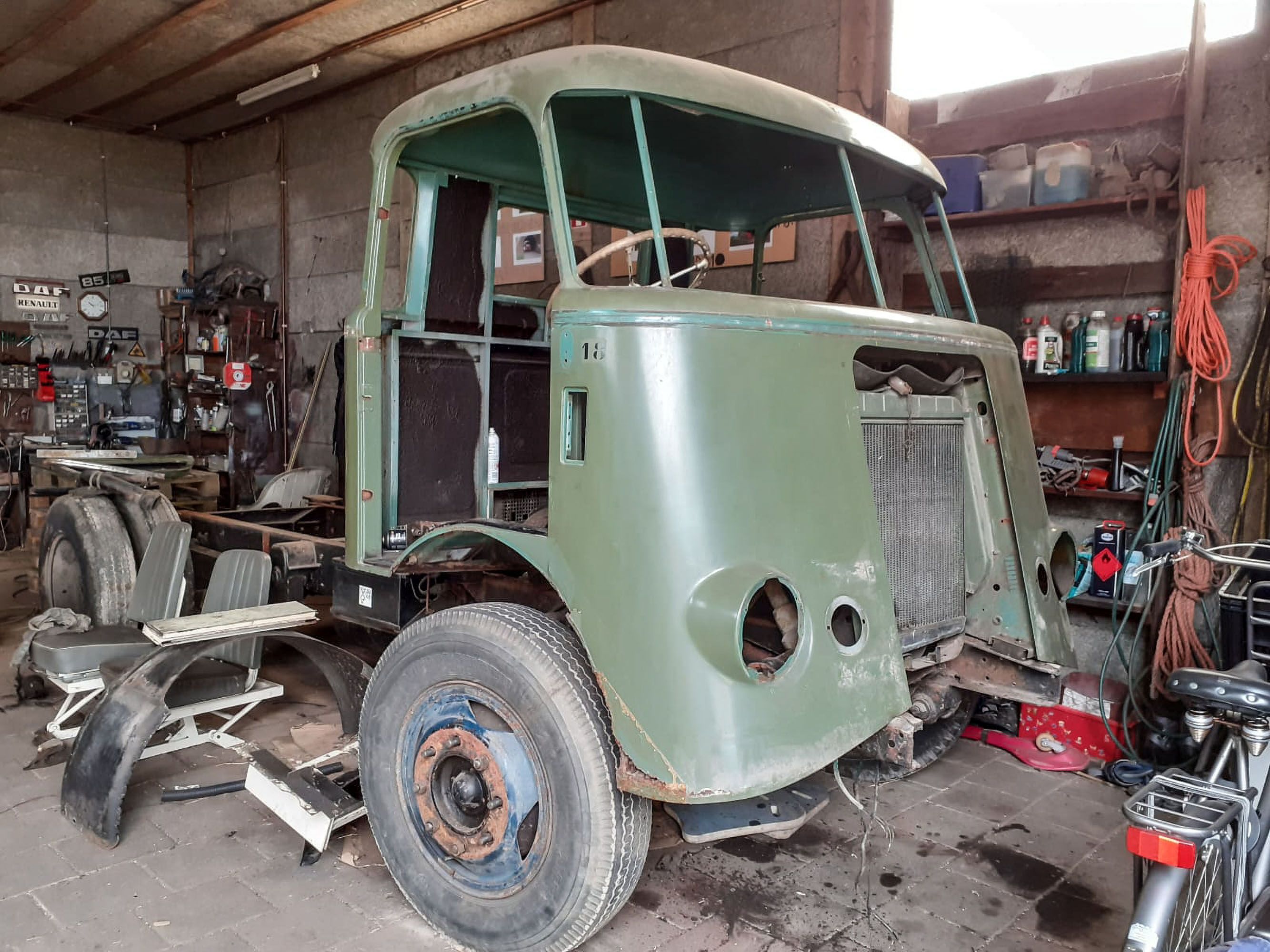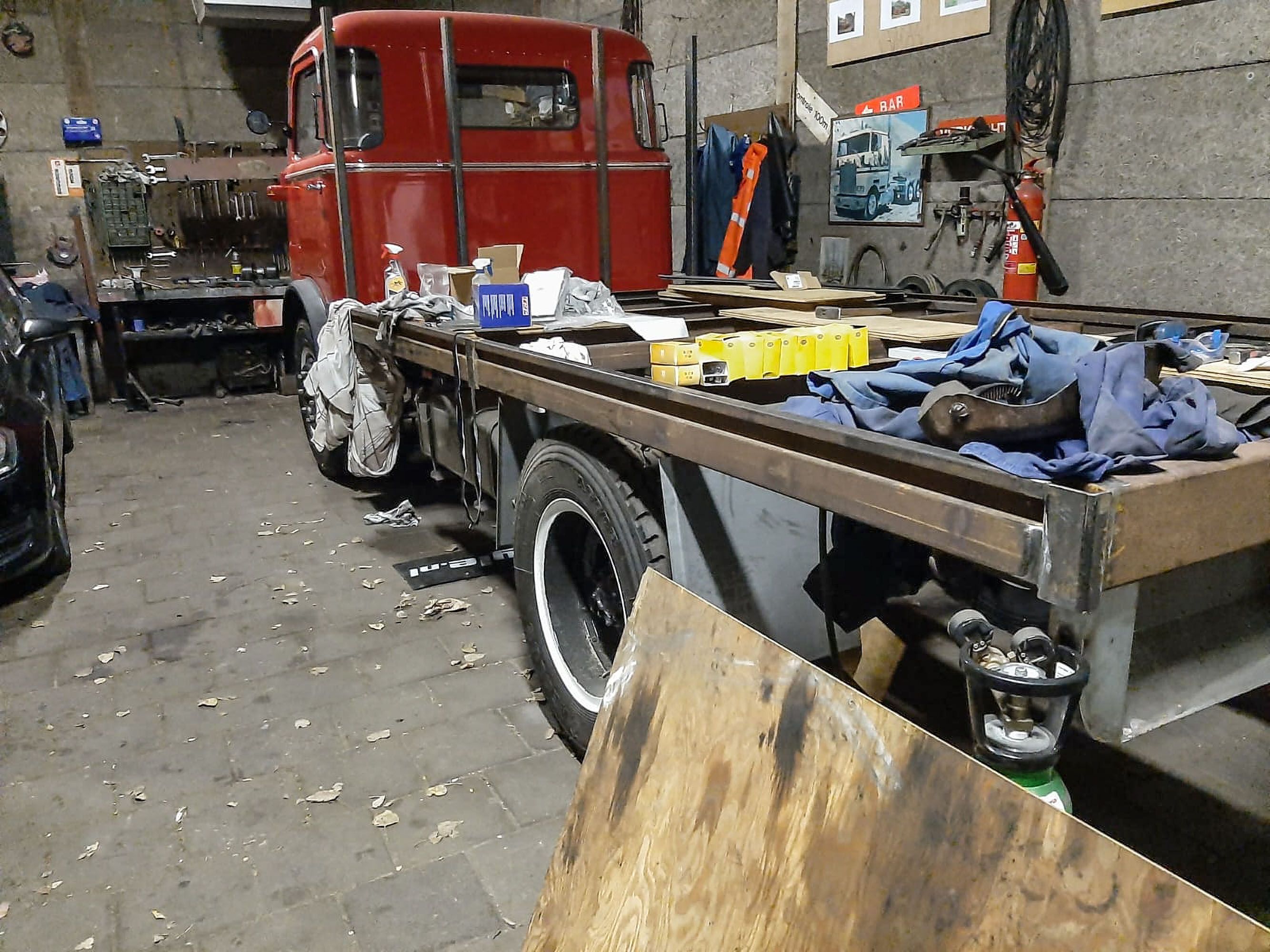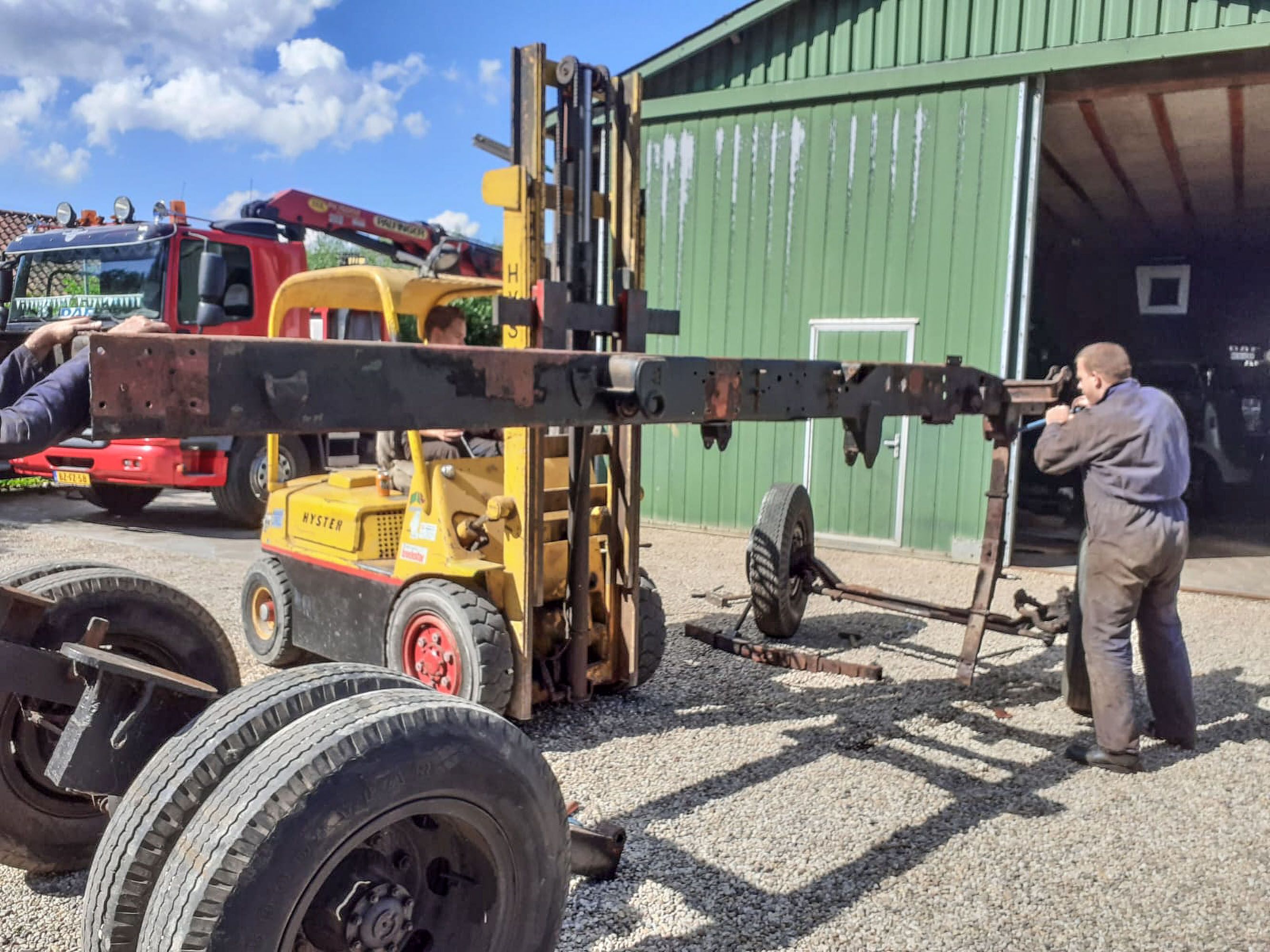 “Het zal rond 2015 geweest zijn, dat we er aan begonnen en als eerste haalden we de cabine van het chassis, dat is niet zo’n groot karwei en dat hebben we al vaker gedaan. Die cabine viel niet helemaal tegen, uiteraard moesten er hier en daar wat delen van het plaatwerk vervangen worden, maar de grootste uitdaging vormden het chassis en de motor.” Gerrit laat wat foto’s zien, die in zijn telefoon opgeslagen zijn. “Het chassis was best afwijkend, dat zal vanwege de opbouw geweest zijn, maar we hebben het allemaal weer naar ‘af fabriek' weten te brengen. Een grote uitdaging was het ombouwen van rechts naar links gestuurd. Naast de aanpassingen in de cabine, zoals het dashboard, moest ook de steun, waaraan het stuurhuis gemonteerd is, van rechts naar links verplaatst worden. Deze zit echter aan het chassis vast gelast. Dat moest dus wel in één keer goed gebeuren. Na veel passen en meten zat dat ook op zijn plek en daarna waren de assen aan de beurt. Die hebben we onder het chassis vandaan gehaald en uit elkaar genomen en, waar nodig, van nieuwe onderdelen voorzien. Het cardan op zich had aan een olieverversing genoeg, dat was nog als nieuw!’”