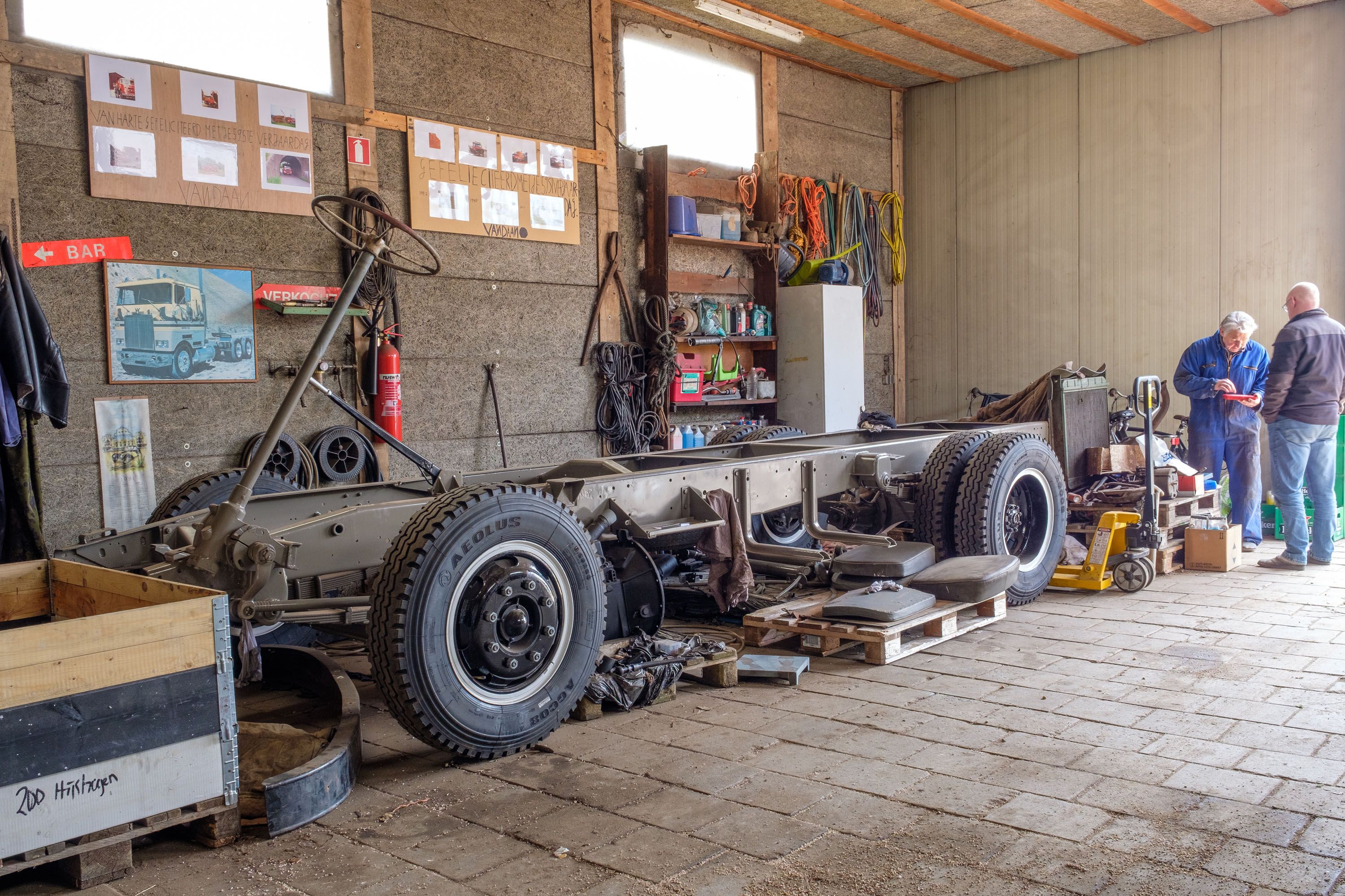 Nu dit opgelost is, is het tijd voor een kop koffie in hun nieuw gebouwde kantine, die meer weg heeft van een mancave. Omdat de zon het nog af laat weten, pikken we hier het verhaal over de DAF zesstreper op, waarvan Gerrit alle details weet op te noemen. De DAF is zijn werkzame leven in juni 1959 als veegauto, met het stuur aan de rechterkant, gestart bij de gemeentereiniging van Almelo. Daarna kwam hij terecht in het Lammers museum in Glanerbrug, waar hij op een gegeven moment buiten kwam te staan. De DAF club kocht hem op en zette de DAF, die inmiddels zijn opbouw kwijtgeraakt was, bij de Gebr. ’t Lam in opslag. Na zo’n tien jaar opslag heeft Gerrit het chassis overgenomen en kocht daarmee een hele uitdaging. “Vergeleken hiermee, is het vastgeroest zitten van een trommelrem maar kinderspel", lacht Gerrit de problemen van zich af. ‘“We hadden al besloten dat het stuur naar de linkerkant moest en verder zouden we het gaandeweg wel ondervinden. Want, je kunt plannen wat je wilt, maar iets wat zo lang heeft stilgestaan, daar is geen planning op te maken.” We nemen het direct aan, als hij dat zegt.