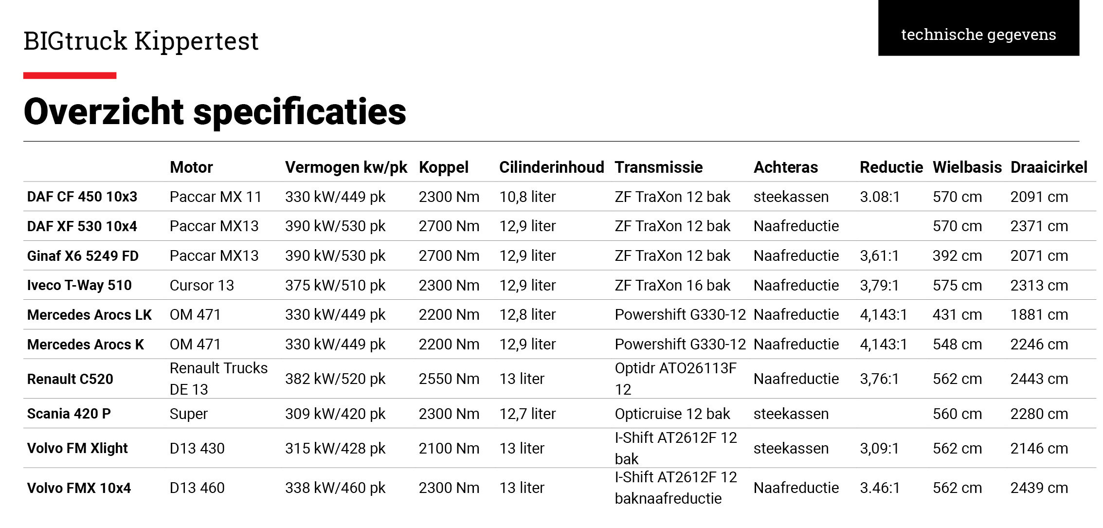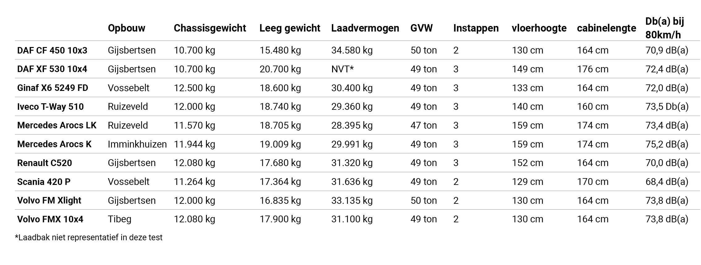 Allereerst een opmerking over enkele reductie of naafreductie. Enkele reductie betekent relatief lichte assen en weinig inwendige weerstand. Dat rolt lichter- en dus zuiniger. Het nadeel is echter de grote ‘klok’ die de bodemvrijheid beperkt. Naafreductie heeft als groot voordeel dat er minder schade is op schade als het voertuig vast komt te zitten. Gebroken steekassen bijvoorbeeld. Wat ons verder opviel is dat er maar twee trucks zijn met een dode hoek camera, namelijk de DAF en de Volvo van Vrijbloed. Dat is, zeker voor trucks die dagelijks in de stad rijden eigenlijk onvoorstelbaar. Een andere opmerking betreft de bediening van de opbouw. Dat is bij alle trucks anders. Soms zijn er duidelijke symbooltjes op de schakelaars, maar vaak helemaal niet. Dat vraagt om standaardisering, want bedieningsfouten kunnen gevaarlijk zijn. Verder kunnen we voor wat betreft de resultaten verschillende winnaars benoemen. De stilste en tevens ruimste truck is de Scania P420 Super. De DAF CF 10x3 van VT heeft het hoogste laadvermogen en een mooie kleine draaicirkel, maar is beperkt inzetbaar. De Volvo FM XLight combineert het op één na hoogste laadvermogen met uitstekende en stabiele rijkwaliteiten en een relatief kleine draaicirkel. Eigenlijk is de ideale 10x4 de truck die het beste past bij de gewenste inzet, en daarvoor vormt de data van deze test een mooi overzicht.
