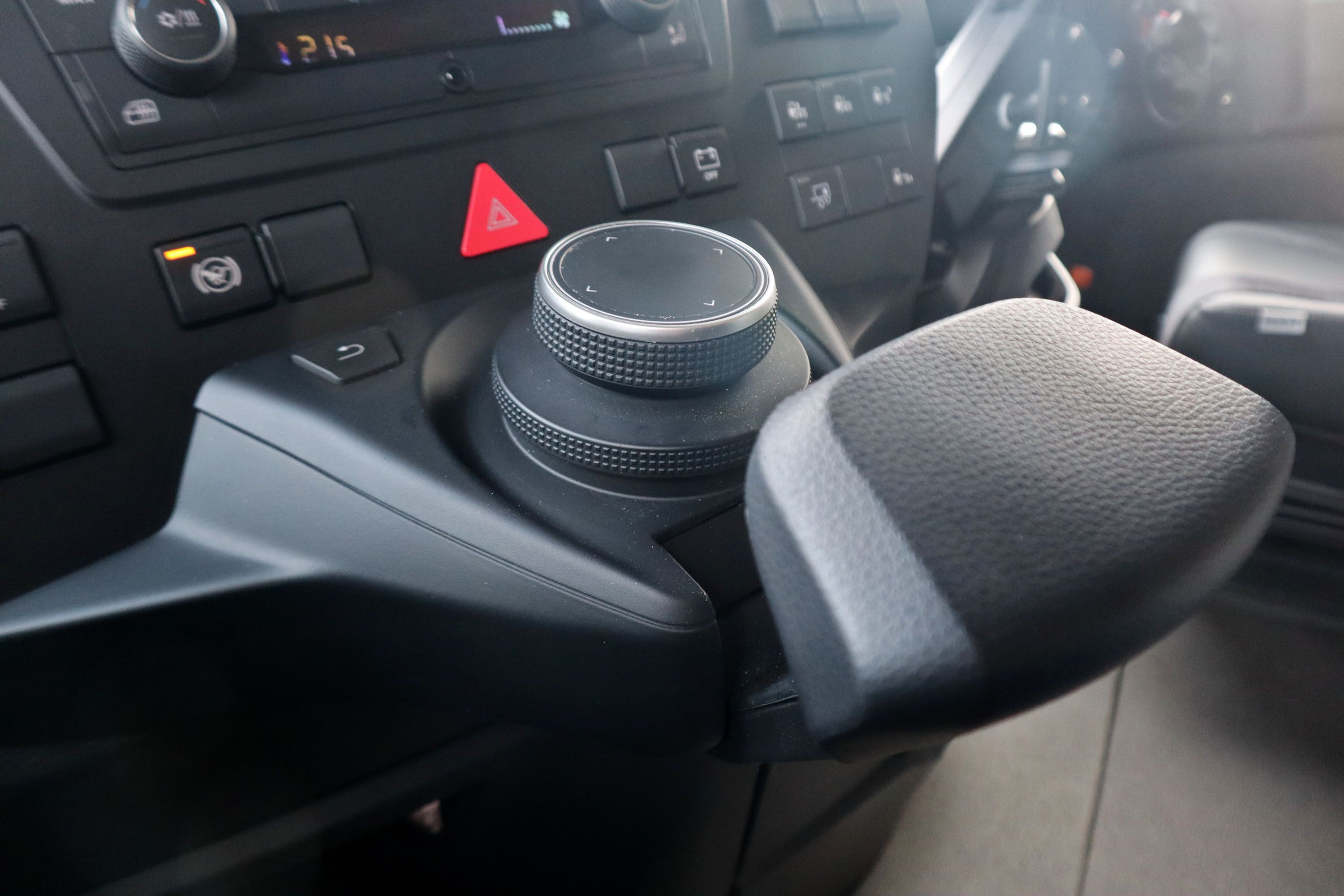 De MAN TGX is voorzien van een groot, dik stuur, dat lekker in de hand ligt. Het geeft een robuust gevoel en ook het dashboard is precies wat je verwacht in een truck. Het is een indrukwekkende cockpit, met veel schakelaars in combinatie met moderne schermen. Dit is wat veel chauffeurs graag hebben. Ook op het stuur zitten duidelijke knoppen voor handige functies. Zo is de boven- en ondergrens van de variabele snelheid heel makkelijk in te stellen, ook in de Eco stand. Iets waar andere merken nog iets van kunnen leren.