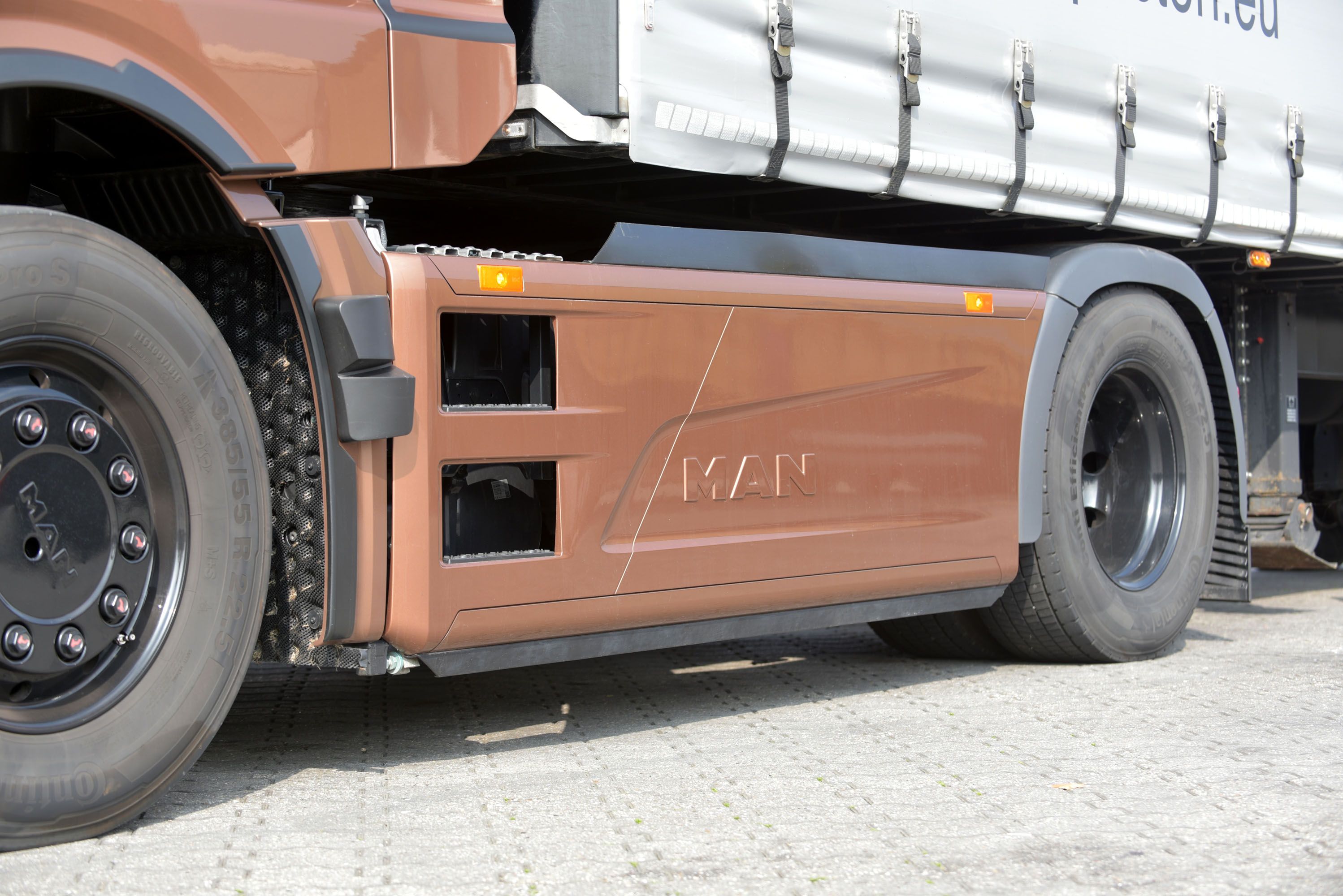Hoewel het front ongewijzigd is heeft MAN wel degelijk gewerkt aan de aerodynamica van de TGX. Zo is de trekker voorzien van nieuw ontworpen sideskirts. Ook is de ruimte onder de voorbumper glad gemaakt voor een betere luchtstroom onder de cabine door. Rubberen afdichtingen en flappen zoals bij andere merken zien we niet op de truck. Dit alles kun je op twee manieren interpreteren. Enerzijds betekent het dat de MAN niet zo zuinig is als hij kan zijn. Echter, een nieuwe cabine is er niet zomaar en over een paar jaar komen er nieuwe Europese regels aan waardoor alles op de schop gaat. Anderzijds laat de MAN TGX iets indrukwekkends zien: zelfs met deze cabine kan deze trekker zich meten met de concurrentie. Dit moet betekenen dat de aandrijflijn op zichzelf erg zuinig is.