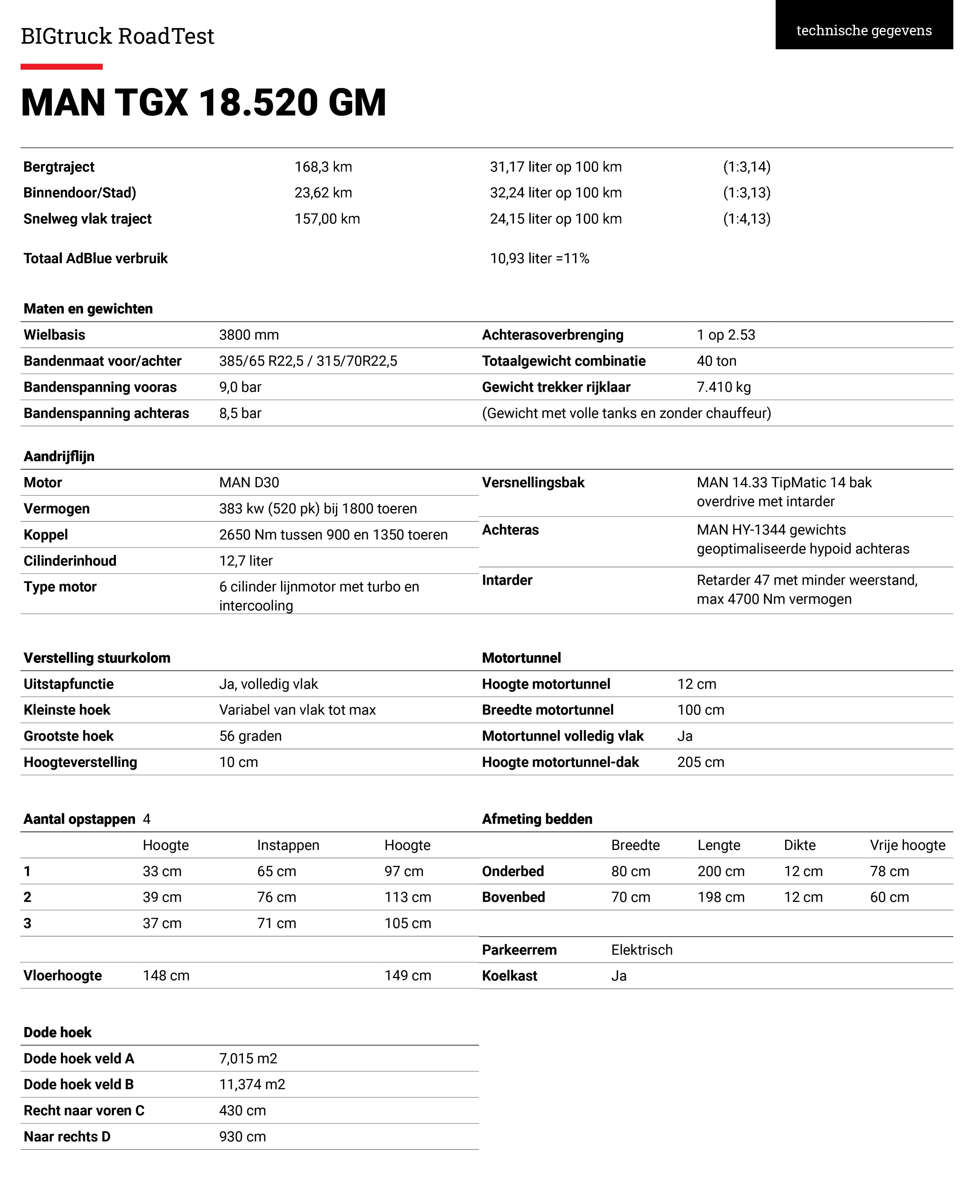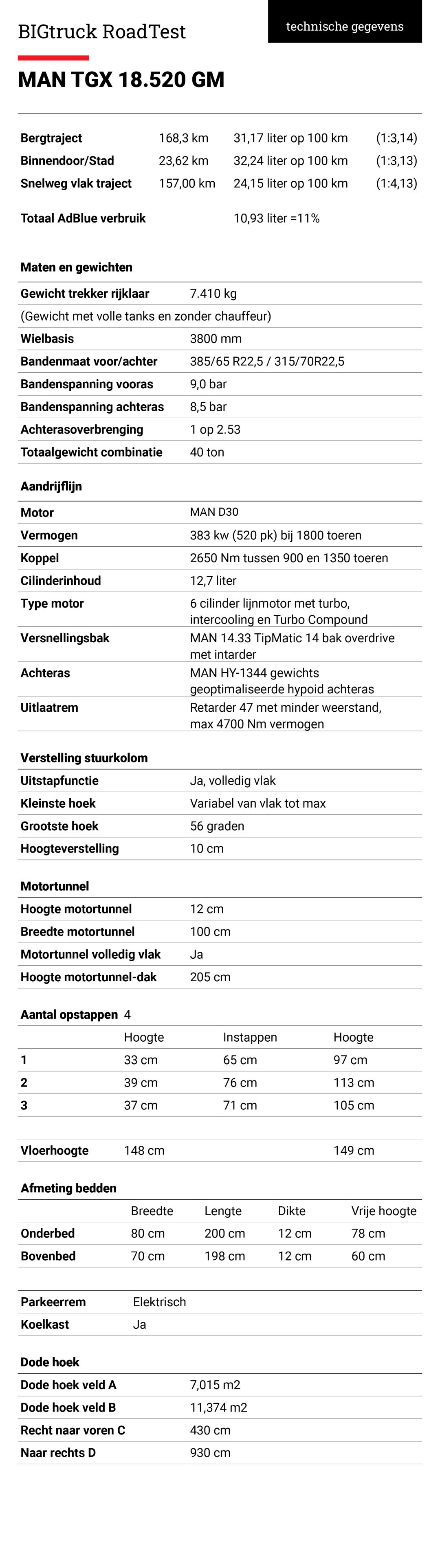 Volgens MAN levert de D30 PowerLion een besparing van 3,7 procent op. Of dit echt zo is, kunnen we niet bevestigen omdat we niet een gelijke TGX met GM-cabine met D26 hebben getest. Op onze testroute naar de Ardennen noteerden wij met een combinatie van bijna 40 ton een gemiddeld verbruik van 1 op 4,13 op het vlakke snelweg traject. Dit is een erg nette score. Op de berg trajecten en op drukke binnendoorwegen steeg het verbruik naar gemiddeld 1 op 3,13. Opvallend genoeg scoorde de MAN met name op het zwaardere traject in de Ardennen beter dan de concurrentie.
