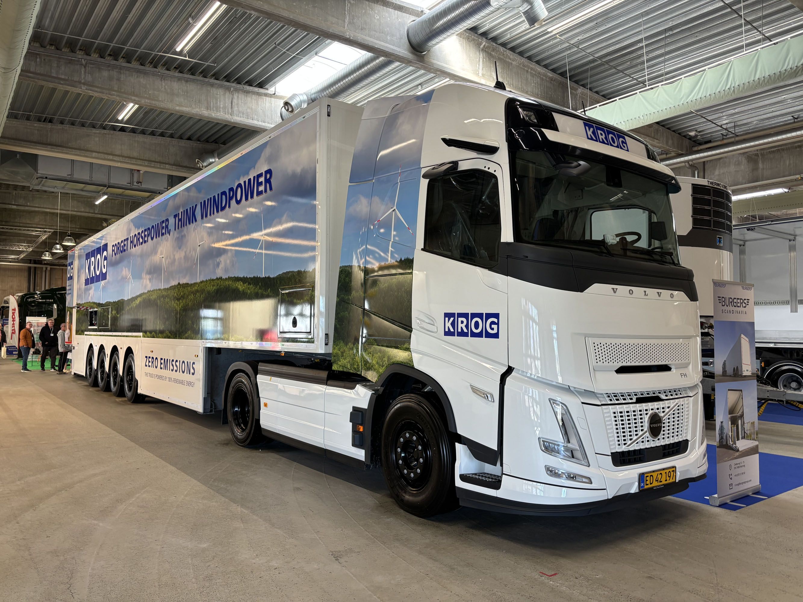 Veel carrosseriebouwers toonden zware trucks met autolaadkranen, zoals bij Stiholt. Opvallend bij alle Deense opbouwers is de aandacht voor details en voor de uitstraling. Met fraaie kasten, uitgekiende accessoires en uitgevoerd in mooie kleurstellingen ziet zo’n Deense truck er altijd tiptop uit. Daarbij wordt werkelijk iedere centimeter benut met kasten en accessoires. Verder viel ons oog op de stand van Krog Transport. Dit bedrijf is importeur voor Burgers in Denemarken en er stond dan ook een indrukwekkende, vierassige Burgers dubbeldekker op de stand. Deze oplegger is 15 meter lang, dat mag gewoon in Denemarken. Met een capaciteit van 63 Europallets een super efficiënte oplegger. In totaal mag je met zo’n vierasser met een enkelas trekker tot 56 ton wegen in Denemarken. Naast Burgers waren ook de Nederlandse trailerbouwers Kraker, Pacton en Nooteboom vertegenwoordigd in Herning.