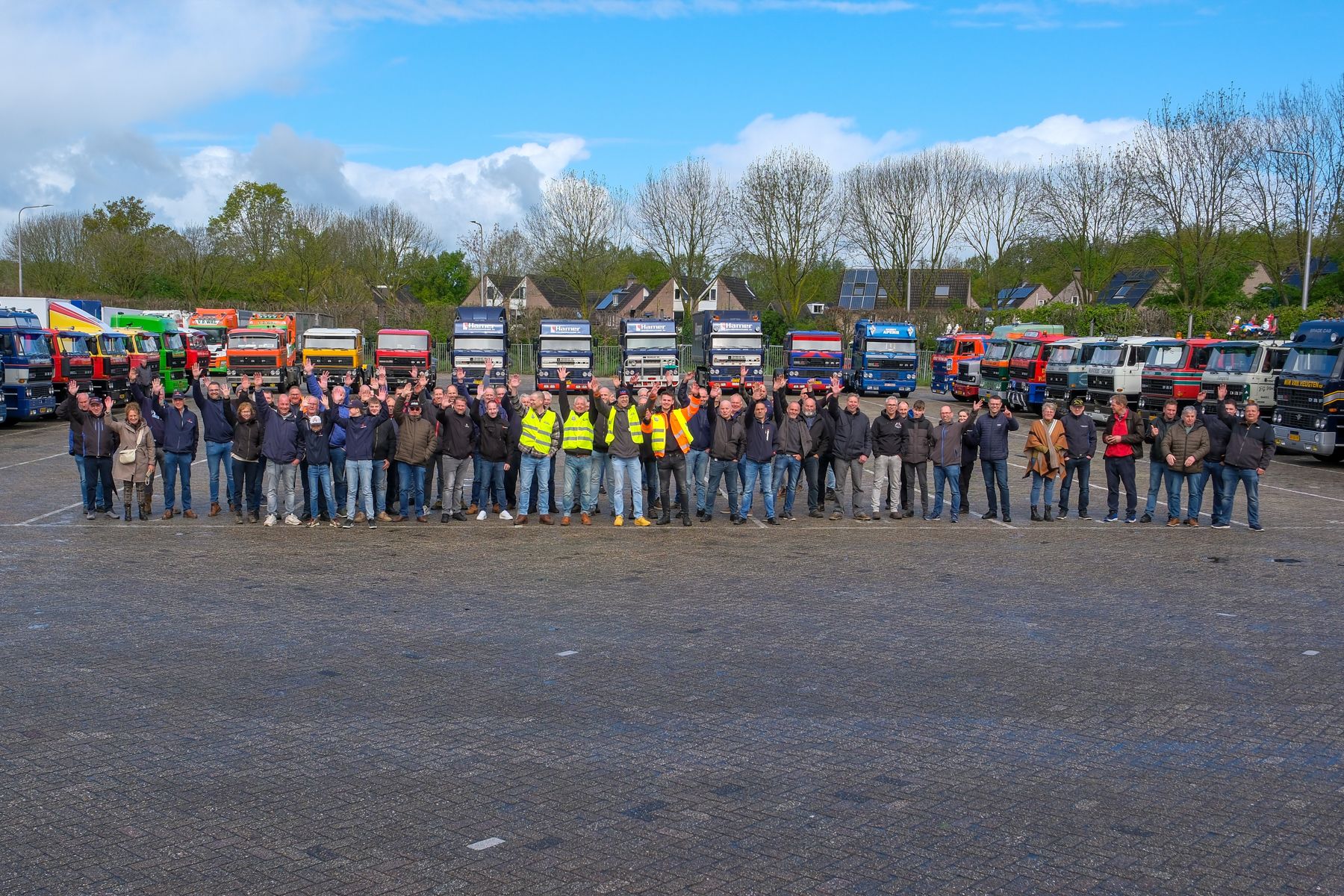En met deze inleiding stonden we dus op 20 april 2024 bij Wegrestaurant De Elft in Grave, waar zo’n veertig DAF’s bijeen kwamen, waaronder één uit Schotland en drie stuks uit België. Vanaf vrijdagmiddag kwamen er deelnemers binnen, op zaterdagmorgen was het passen en meten om alles netjes in het gelid te zetten en vooral, veel praten met elkaar. De Elft was speciaal voor dit evenement open op zaterdag en dat werd gewaardeerd. De koffie was lekker en warm, net zoals het restaurant. Wat zeer welkom was, want de weergoden hadden die dag niet hun beste bui. De temperatuur bleef steken bij een graad of 8 à 9 en er viel de nodige regen en hagel. Niet dat dat het humeur van de deelnemers aantastte, daar is meer voor nodig! Nadat de laatste deelnemer binnen was, klaarde de lucht een beetje op en werd het zelfs droog. De deelnemers werden daarop bijeengeroepen voor het maken van een groepsfoto.