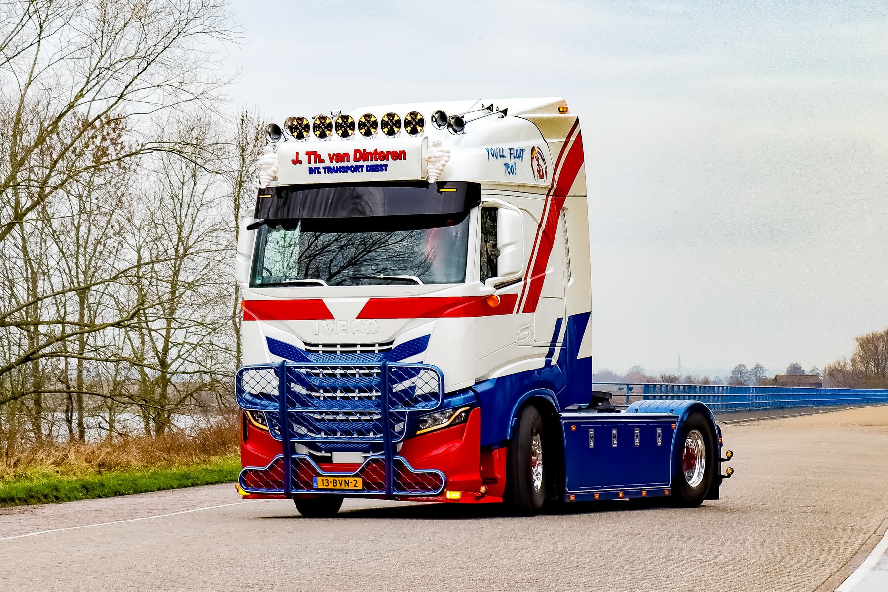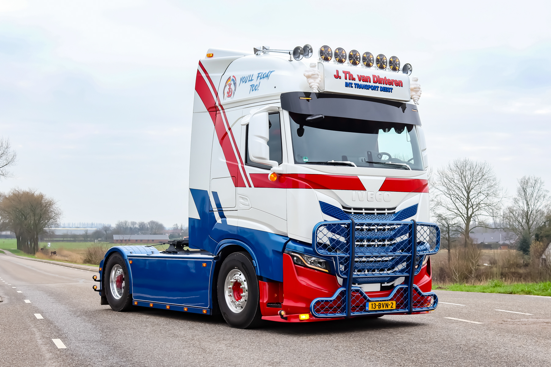Dat je van een Iveco S-Way een hele dikke showtruck kunt maken was al eerder bewezen, maar wat Dirk van Dinteren op straat heeft gezet is toch wel weer heel speciaal. Hij liet zijn nieuwe S-Way volledig opbouwen, liet de truck in parelmoer lak spuiten met verschillende lagen blanke lak en liet als thema de ‘Dancing Clown Pennywise’ uit de film It op de achterwand spuiten. Aan de zijkanten siert de tekst ‘You’ll Float Too!’ de cabine.
