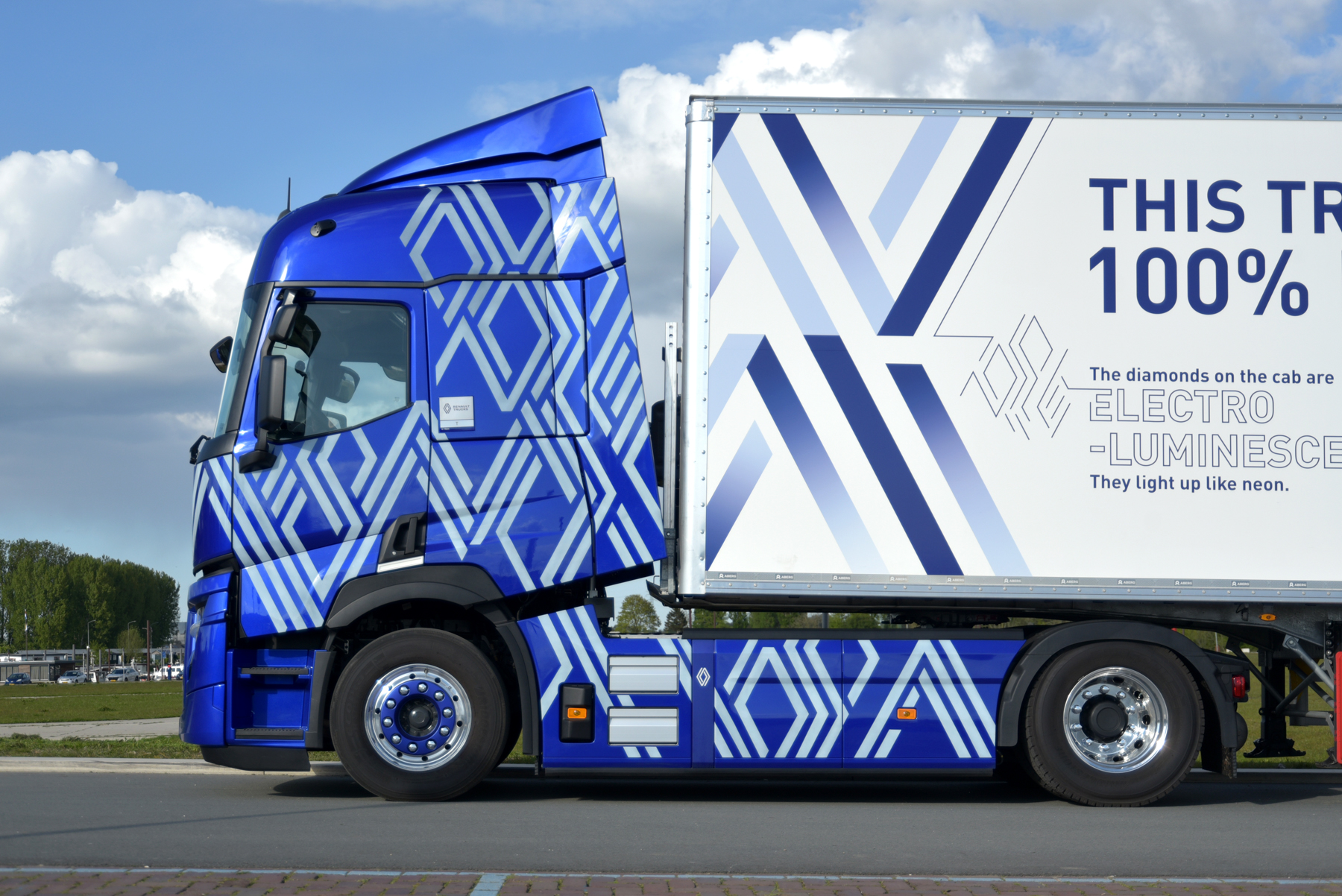 Renault Trucks doet een Europese toer met deze elektrische truck. Over 10.000 kilometer worden allerlei landen bezocht om zo klanten en de pers kennis te laten maken met de nieuwste elektrische truck van het Franse truckmerk. De trekker, met de naam ‘Diamond Echo’ is voorzien van speciale LumiLor lak. Deze lak is gebaseerd op de Lumilor-technologie en is aangebracht door Demon Paint. Wanneer de lak wordt blootgesteld aan een elektrische prikkel (er loopt elektrische stroom doorheen), gaat hij gloeien zodat het design oplicht. Dat mag natuurlijk niet als je rijdt, maar er mag wel meer niet, en het is wel heel cool.