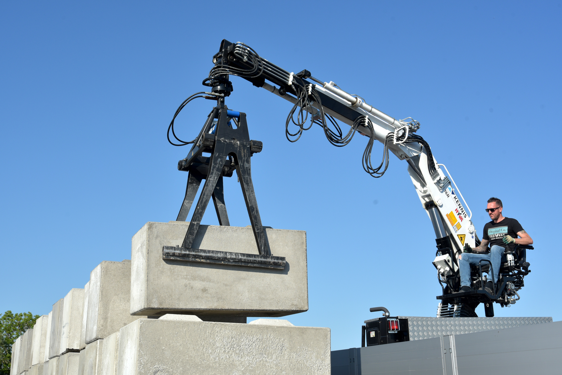 Ritsema heeft naast steenopleggers ook kippertrailers en schuifzeilopleggers in de vloot. Jeroen rijdt meestal met de stenentrailer, maar de DAF is voorzien van een hydrauliek unit, waardoor hij ook met de kippertrailers kan rijden. “Soms doen we ritten naar België om daar speciale grondstoffen te laden met de kippertrailers. Mooie ritjes, waarmee je een hele dag bezig bent.” De rit van vandaag gaat vanuit de Eemshaven, waar we bij Pouw betonblokken laden voor een keerwand. Ritsema handelt niet alleen in bestrating en grondstoffen, maar ook in deze betonblokken. Het bedrijf verkoopt, vervoert en verhuurt deze blokken met een gewicht van 2,5 ton per stuk. Onze lading moet naar Meppel, waar ze bij KWS als silowanden gaan fungeren voor de opslag van losgestort wegenbouwmateriaal. “Ik doe drie ritten per dag nu, en dat een dikke week voor deze klus. Mooie ritjes zo, met steeds 12 van die 2,5 tons blokken. Daarmee ben ik precies 50 ton totaal. Het laden en lossen gaat lekker snel met maar 12 van die blokken!” Intussen rijden we vanuit de Eemshaven via Veendam richting Assen, om bij Pesse binnendoor naar Meppel te rijden. De DAF snort lekker en Jeroen rijdt heel relaxed met de auto.