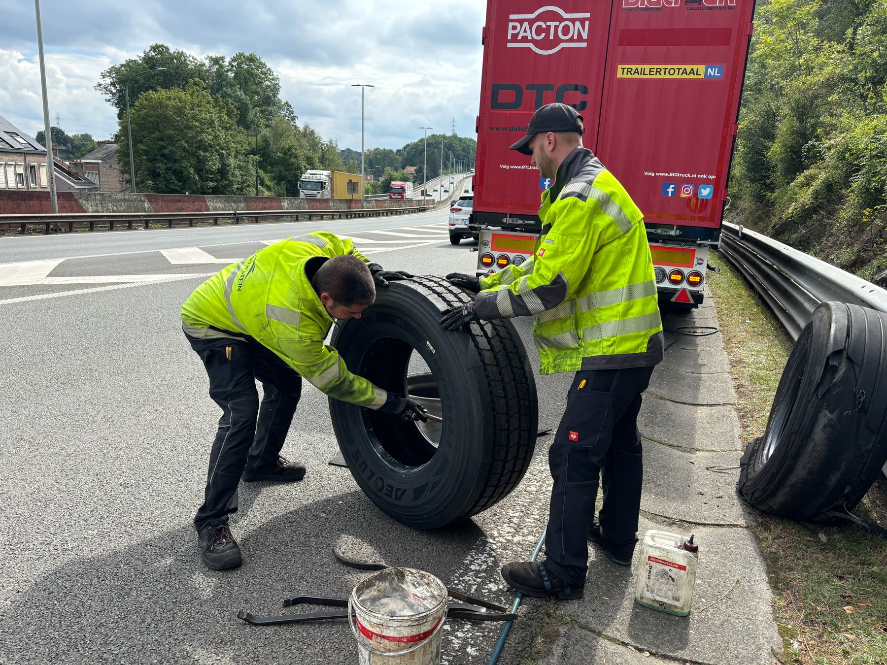 Al rijdend wennen de camera’s echt heel snel. Ik heb het eerder geschreven, Volvo heeft op dit moment echt het mooiste systeem. Het beeld is scherp en je hebt een prima beeld, ook in tunnels. Als het echt donker is dan werkt de infraroodcamera ook prima. We rijden lekker door, via Maastricht naar Luik, om daar richting Aken te rijden. Vervolgens pakken we de E42 richting Verviers als ik vlak voor afrit Dison een enorme klap hoor. In de spiegel zie ik nog net een lap rubber wegslingeren in een grote stofwolk. Dat betekent zoveel als een klapband op de eerste as van de trailer. Nadat ik de schade heb bewonderd, besluit ik stapvoets naar de afrit te rijden. Daar is meer ruimte om eventueel te sleutelen dan aan de krappe vluchtstrook. Daar blijven was zeker een afsleep gevalletje geworden en dat kost dan meteen goud geld. Twee politieagenten zijn dat met me eens: "Als jullie op de uitkijk staan om het verkeer te waarschuwen, mogen jullie hier repareren.” We melden de stranding bij Volvo Action Service en die schakelen op hun beurt Profile in Maastricht in. Wachten duurt altijd lang, maar als de mannen eenmaal ter plaatse zijn gaat het hard. De geplofte Goodyear wordt van de Alcoa velg gehaald en met bandenlepels wordt er een nieuwe Aeolus trailerband gemonteerd. Top service mannen! Echt super hoe handig jullie dat doen!