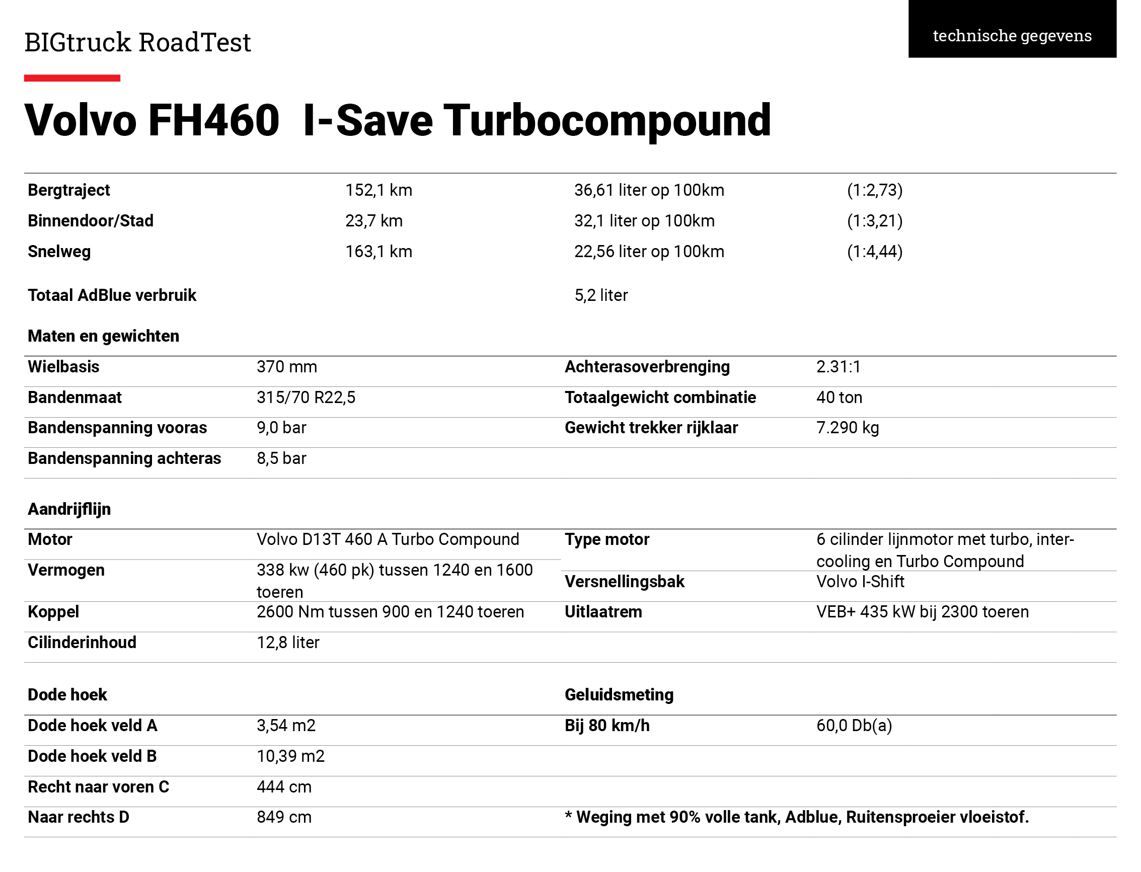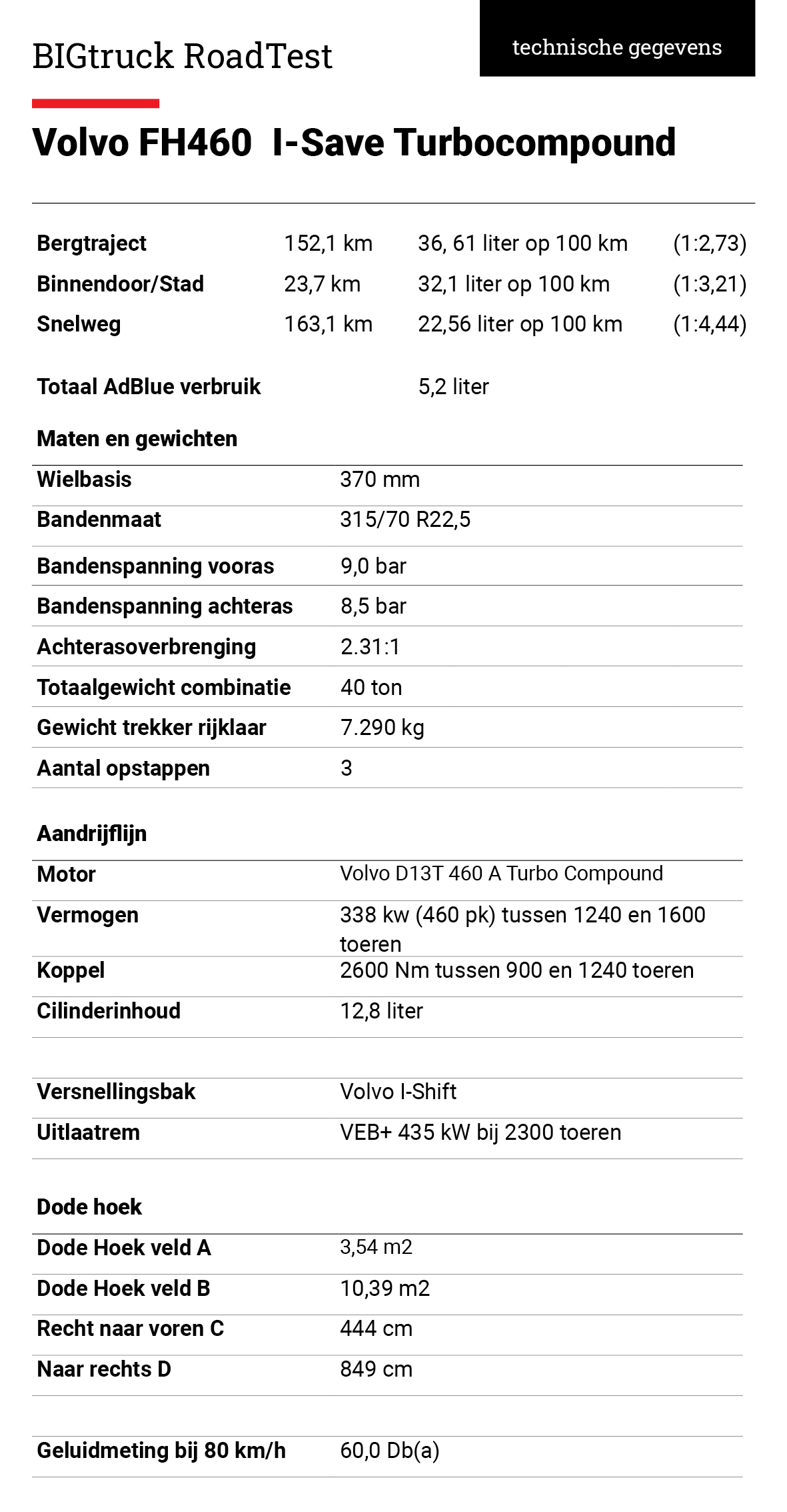 Na onze testrit wordt het tijd om de balans op te maken. De Volvo FH 460 I-Save met Turbocompound reden we ook in 2022 met dezelfde oplegger dus we kunnen vergelijken. Dat is natuurlijk wel met een slag om de arm, want de omstandigheden qua wind en temperaturen zijn nooit helemaal gelijk. Zo hadden we deze keer een korte periode lichte regen en een nat wegdek, en dat heeft meteen gevolgen. Toch kunnen we stellen dat het Aero pakket werkt. We reden namelijk 2% zuiniger op het vlakke gedeelte en ook op het bergtraject komen we zuiniger uit dan twee jaar geleden. Dat wil zeggen dat die nieuwe stroomlijn neus werkt! Theoretisch zou het nog beter moeten kunnen door alles in Eco mode te rijden maar dit is nou eenmaal geen theoretische test. Alles bij elkaar maakt Volvo het dus wel waar met de Aero. Minder luchtweerstand werkt gewoon, maar dat wisten we al natuurlijk.