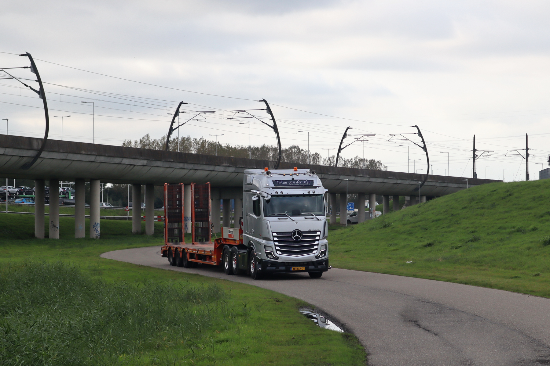 Als retourlading moet Johan twee schaarliften ophalen bij bedrijven in de haven. De eerste staat bij een bedrijf waar treinen onderhouden wordt. Binnen tien minuten staat de machine op de trailer. Ook op de tweede locatie, bij een groot logistiek bedrijf, is de schaarlift snel gevonden. Al snel zijn we weer op pad. De lucht is nog steeds erg grijs, maar even stoppen we langs het Hartelkanaal voor wat foto’s. De trailer wordt even afgekoppeld. Trots bekijkt Johan zijn nieuwe Actros. “Ik ben erg blij met mijn diesel”, concludeert hij tevreden.